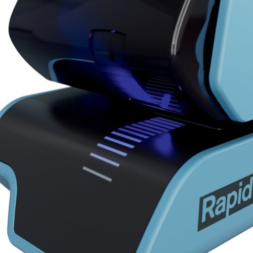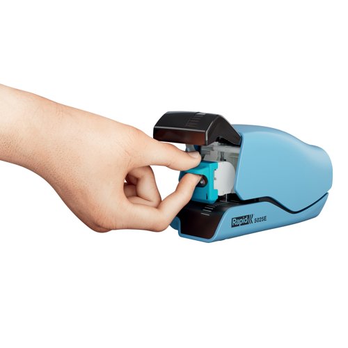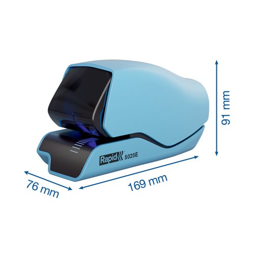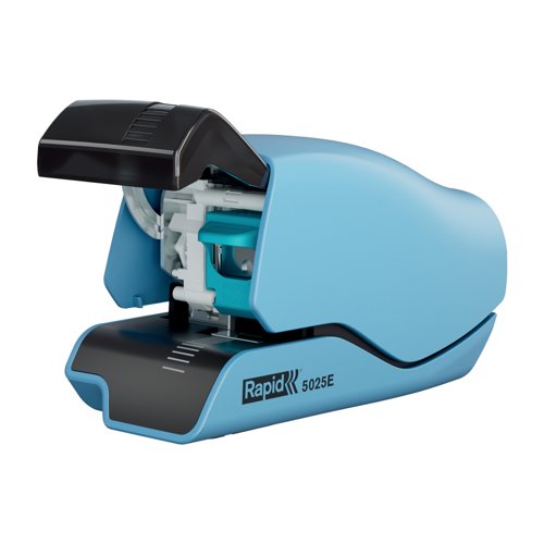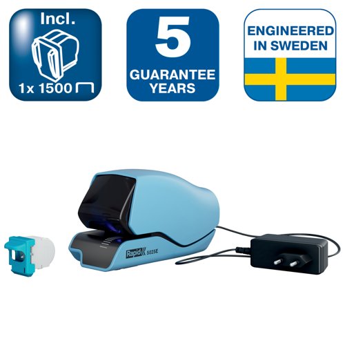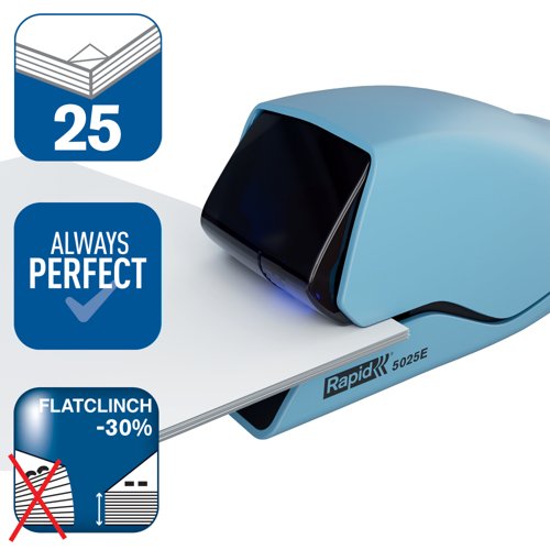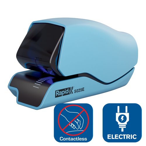 - The Rapid 5025E effortlessly staples up to 25 sheets of paper at a time (80 gsm). Designed for high-frequency stapling environments such as offices, hotel receptions, and cashier desks, this electric stapler ensures effortless and reliable performance. For enhanced accuracy and efficiency, the 5025E features an LED Guiding System that precisely indicates where each staple will be placed. Enjoy hygienic stapling with its no-touch, contactless operation. Powered by a mains adaptor (included) and comes with 1x cassette (1,500 staples).