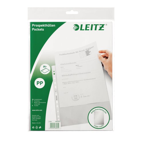 - Pockets with a clear matt finish ideal for every day use at home, in the office or at school. The 11 hole multi-punched reinforced strip allows convenient storage of documents in lever arch files and binders, protecting them from moisture, dust and dirt. Opens at the top for easy access to documents without releasing binder mechanism. Copy-safe and acid free material ensures long-term protection of the documents. Made from PP (polypropylene) plastic with 30% pre-consumer content and 100% recyclable.