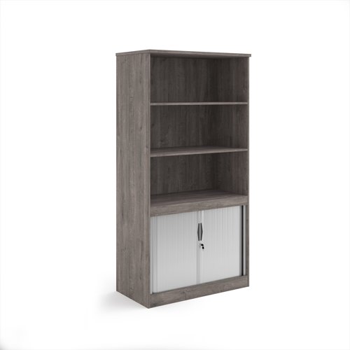 Systems combination unit with tambour doors and open top 2000mm high with 2 shelves - Grey Oak