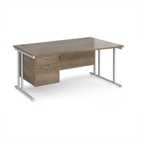 Maestro 25 right hand wave desk 1600mm wide with 2 drawer pedestal - white cantilever leg frame, Nebraska oak top