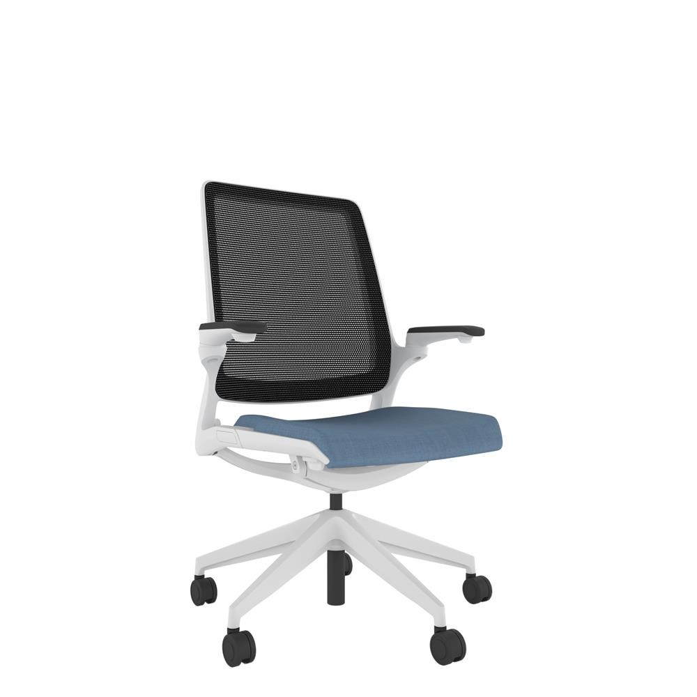 The simple button activated weight balancing movement is unique - simple, smooth and like no other. The hinged frame allows for the anti-knee rise tilting action to naturally follow body movements, improving support and allowing a permanent connection between chair and user. Complementary black and white frame finishes, backrest designs in upholstered or self-supporting mesh, the shade and effect combinations are endless when connecting the chair to the environment. The armrests add another dimension. Height and twist adjustments are not unusual, but combine that with a tilting angle feature and support is created for the tablet and mobile device user. Another connection is made.