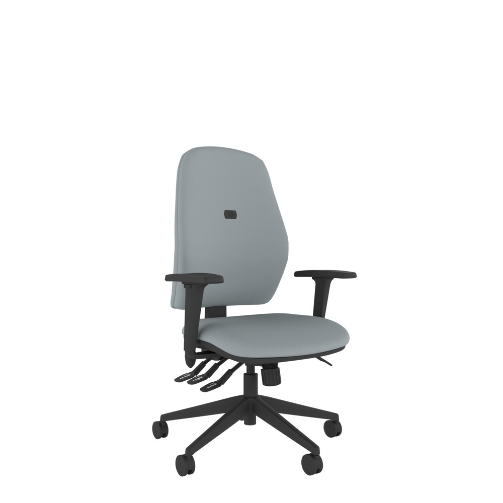 Upholstered high back - Ratchet back eight adjustment - Inflatable lumbar support (250mm from bottom of back) - Medium seat - 50mm seat slide - Heavy duty 3 lever mechanism - Independent seat and back angle adjustment - Adjustable body tension control - Double curved posture waterfall seat - Ergo-density foam - 150KG weight limit. Group 1 fabric.
