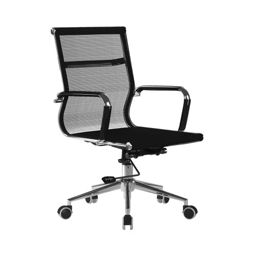 - This medium back contemporary classic designer executive chair is upholstered in mesh and is suitable for both a workplace or home office environment. Offering a strong single piece chrome frame with rolled top and seat base with complementing integral chrome arms with bonded leather sleeves, it has a heavy duty gas lift 154 kilos (25 stone) for easy seat height adjustment, and a mechanism which allows the user to fully recline in the chair and is adjustable for individual – bodyweight (tension control) which can be locked in the upright position. It is finished with a polished chrome spider base with twin wheel hooded castors.