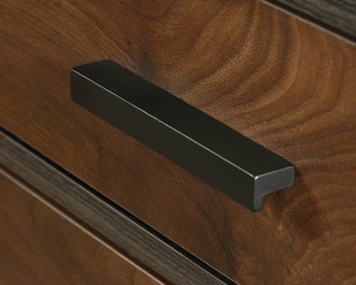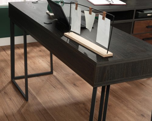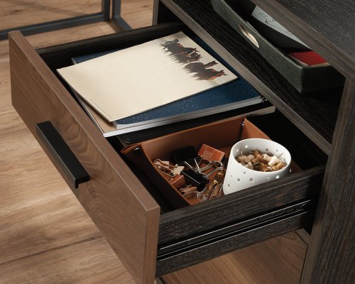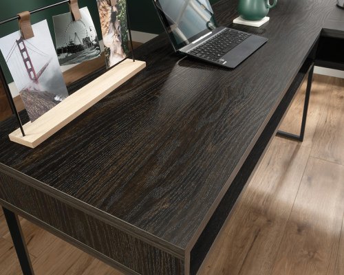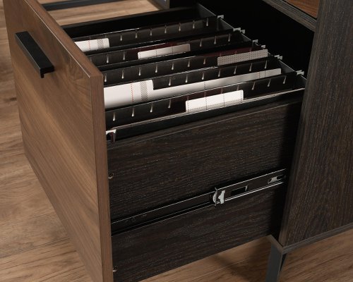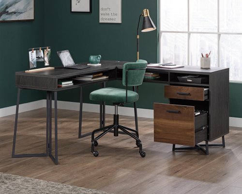 - The Teknik Office Canyon Lane L-Shaped Desk is the ideal choice for anyone seeking a stylish and functional workspace. With its elegant Brew Oak effect finish paired with Grand Walnut effect accents, this desk brings a sophisticated touch to any office or home study. Crafted with a durable 1” thick desktop, the desk provides a spacious and sturdy surface for all your work needs. The powder-coated metal base ensures stability and longevity. The generous desk and return offer plenty of room to spread out, whether you're working, studying, or organizing. Two drawers with full extension slides provide easy access to essential documents and office supplies, while the lower filing drawer is designed to hold letter-sized hanging files, keeping your files neatly organized. There are also additional cubbyhole areas under the desktop offer even more storage options for books, gadgets, or personal items. Thoughtfully designed with cord management features, the Canyon Lane L-Shaped Desk keeps your workspace neat and free of clutter. Finished on all sides, it’s versatile enough to be placed in any configuration, whether against a wall or as a centrepiece in the middle of the room.