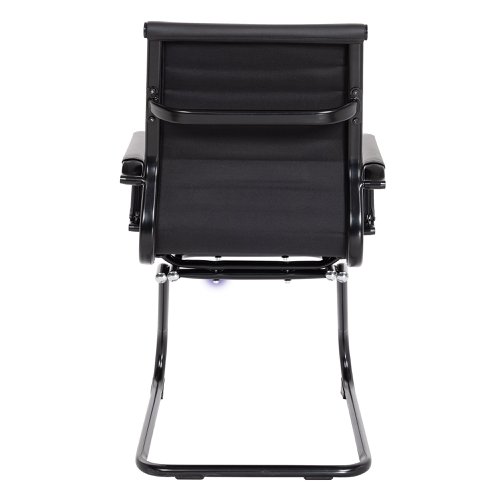 - This medium back contemporary classic designer cantilever armchair offers detailed stitching design, a strong single piece Black frame with rolled top and seat base upholstered in plush bonded leather with complementing integral Black arms and matching bonded leather sleeves, and is suitable for both a workplace or home office environment.