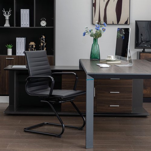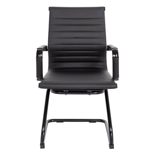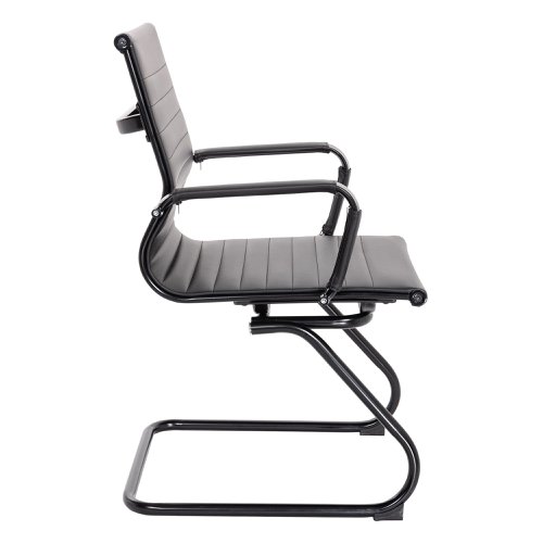 This medium back contemporary classic designer cantilever armchair offers detailed stitching design, a strong single piece Black frame with rolled top and seat base upholstered in plush bonded leather with complementing integral Black arms and matching bonded leather sleeves, and is suitable for both a workplace or home office environment.