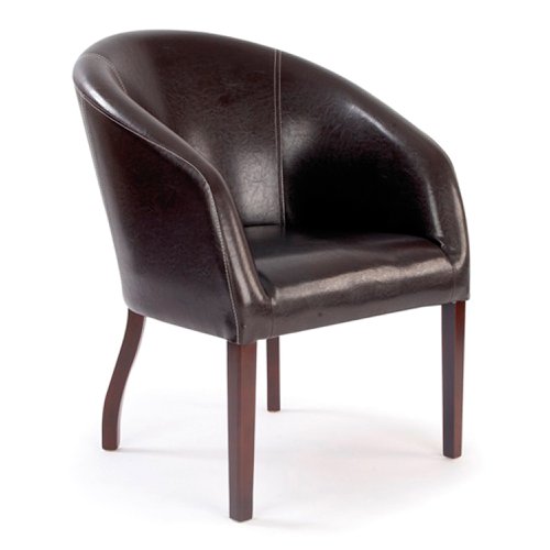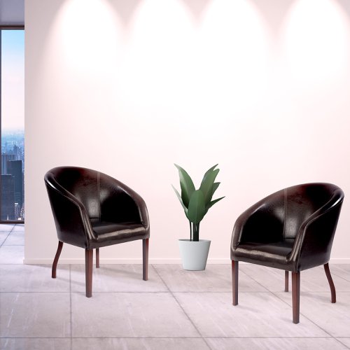 - This modern curved armchair offers a generously deep cushioned seat and backrest adorned with sectional leather effect upholstery and stylish stitch detail. Complemented with a robust framework, it is finished with mahogany stained legs, and is ideal for communal, meeting room and reception areas.