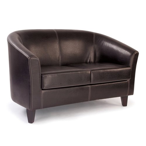 - This stylish modern two seat ‘tub’ style sofa offers a generously deep cushioned seat and backrest, adorned in a durable chocolate brown leather effect sectional upholstery with stylish stitch detail. A robust framework is finished with a mahogany stained leg frame and is ideal for meeting room and reception areas.
