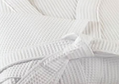 Made from a blend of cotton and polyester (50/50), this waffle bath robe comes in one size, fitting most body sizes and shapes. The fabric is lighter in weight than traditional terry cotton robes and suited for use in warmer temperatures. Fully machine washable, and quick drying, the robe can be recycled. Supplied in a pack of 10 white waffle bath robes.