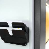 The Durable FLEXIPLUS 2 A4 Magnetic Literature Holder in black is a dual-compartment display solution for A4 landscape brochures, flyers, and informational materials. Featuring a strong magnetic backing, it securely attaches to metal surfaces, providing a flexible and tool-free mounting option for offices, trade fairs, retail spaces, and industrial environments.