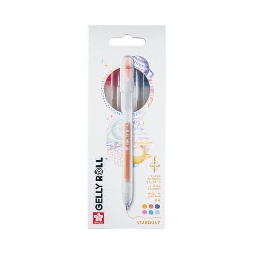 | This set consists of 6 retractable gel pens with glittering stardust orange, red, rose, purple, blue and green ink |