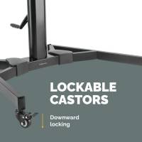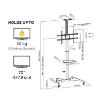 - Designed for dynamic work environments, this portable TV stand is ideal for presentations, video conferencing, and collaborative setups. Its sleek, space-efficient design supports screens up to 70in and 50kg, combining robust stability with modern aesthetics. Mobility is effortless thanks to four heavy-duty casters, each equipped with a locking mechanism to keep the stand securely in place when needed. A smooth crank handle allows for height adjustments across a 40cm range, making it easy to tailor the viewing angle to your space. The stand also offers flexible screen positioning, with support for both portrait and landscape orientations and a 20° tilt to reduce glare and improve visibility. Integrated cable management keeps wires neatly tucked away, while two built-in shelves provide convenient storage for AV components, helping you maintain a clean and organised setup.