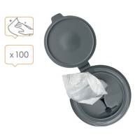 | Hinged lid allows quick and easy access and prevents drying out, while the perforated edge allows single-wipe dispensing for ease of use. |