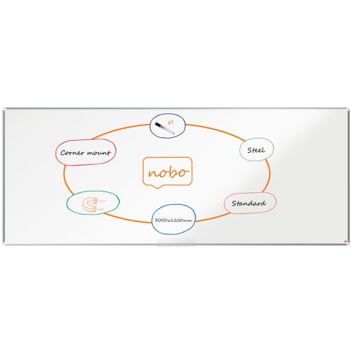 - The Nobo Premium Plus Steel Magnetic Whiteboard in 3000x1200mm is an ideal solution for large workspaces, offices, and classrooms where communication and collaboration are key. This spacious whiteboard features a modern aluminium trim with stylish corner caps, complementing environment. Designed for moderate use, the painted steel surface offers enhanced erasability reducing ghosting and resisting stains, scratches, and dents , ensuring a clear and smooth writing experience. This board enhances writing clarity, making messages bold and easy to read. Its concealed traditional through-corner mounting allows installation in either portrait or landscape orientation for added flexibility. The magnetic surface is perfect for displaying notes, documents, and visual aids, while a convenient clip-on accessories tray keeps markers, erasers, and magnets organised and within reach. Nobo Premium Plus Whiteboards proudly carry the globally respected EU Ecolabel, recognising environmental excellence and ensuring reduced impact throughout the product life cycle
